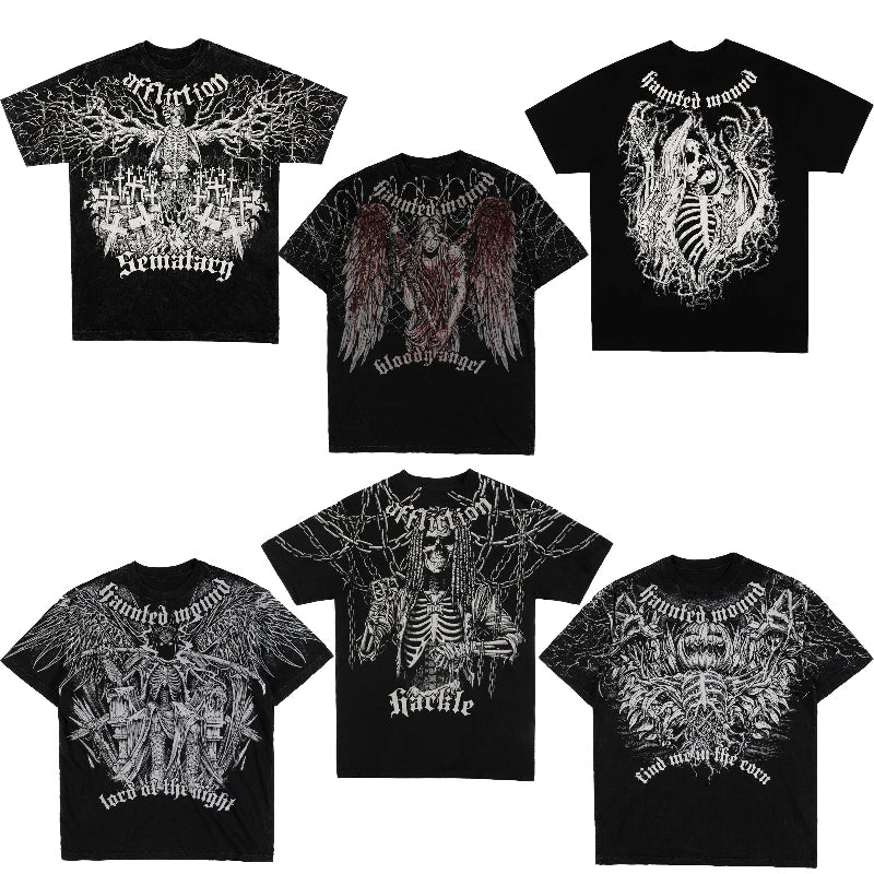 The Affliction & Sematary Tee channels raw gothic energy with a washed black finish and bold retro graphic print. Inspired by underground metal, trap, and high-street streetwear, this tee is made to feel worn-in and lived-in from day one.